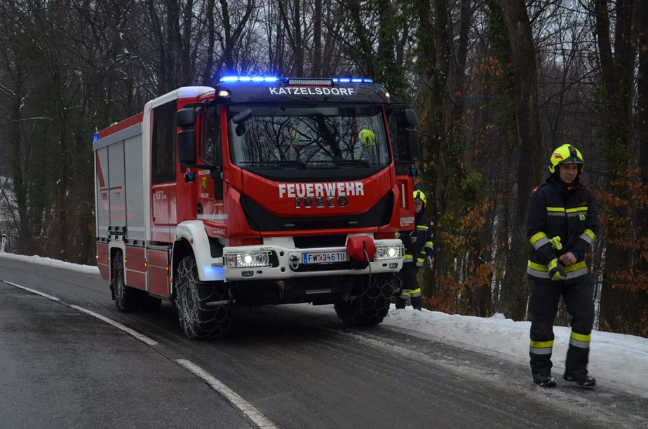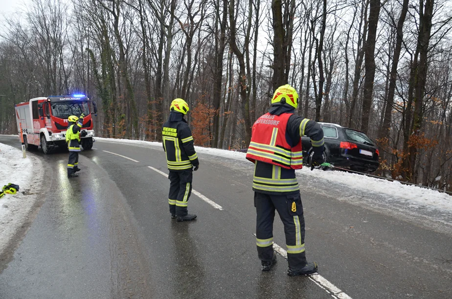 Bei unserem gemeinsamen Eintreffen mit der Feuerwehr Wilfersdorf, Absichern und Erkundung der Lage, wurde der PKW mit beiden Seilwinden der HLFs aus der misslichen Lage, zurück auf die Straße gezogen.