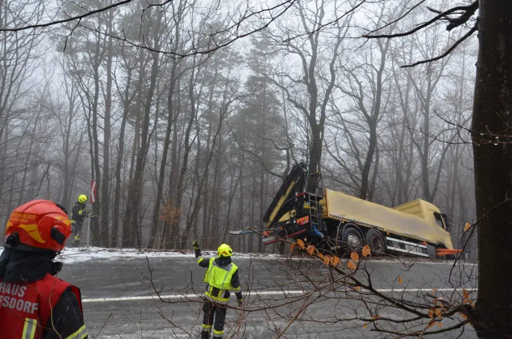 Gemeinsam mit der Feuerwehr Wilfersdorf wurde der LKW seitlich gesichert, um ein weiteres Abrutschen zu verhindern. Parallel dazu konnte das Kranfahrzeug den Lastwagen kontrolliert zurück auf die Fahrbahn zurückziehen.